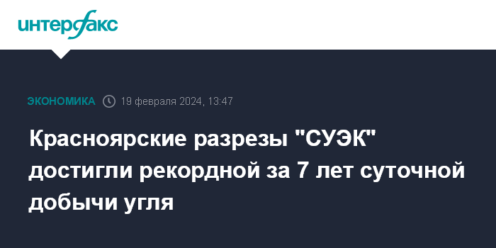 Москва. 19 февраля. INTERFAX.RU - Красноярские предприятия АО "Сибирская угольная энергетическая компания" ("СУЭК") 18 февраля достигли максимального с декабря 2017 года суточного объема добычи угля - 176 тысяч тонн, сообщила компания.