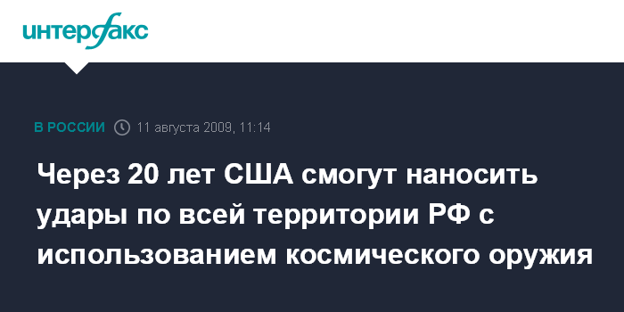 Москва. 11 августа. INTERFAX.RU - Через 20 лет США и ряд иных иностранных государств будут способны наносить удары по всей территории России с воздушно-космических аппаратов и оружием, созданным на новых физических принципах, заявил на пресс-конференции в Москве во вторник главком ВВС РФ Александр Зелин. По его словам, такая возможность у иностранных государств появится до 2030 года.