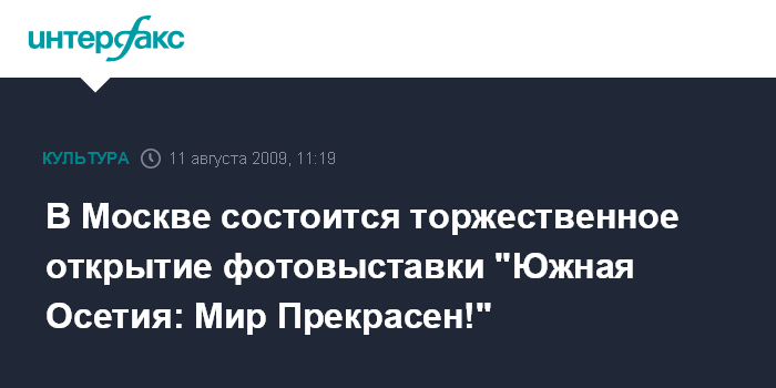 Москва. 11 августа. INTERFAX.RU - В пятницу, 21 августа 2009 г., в 12:00 на Гоголевском бульваре в Москве состоится торжественное открытие фотовыставки «Южная Осетия: Мир Прекрасен!», приуроченная к первой годовщине признания Россией независимости Республики Южная Осетия.