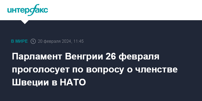 Москва. 20 февраля. INTERFAX.RU - Парламент Венгрии намерен провести голосование о присоединении Швеции к НАТО 26 февраля, сообщил во вторник Bloomberg со ссылкой на лидера парламентской фракции правящей партии ФИДЕС Мате Кочиша.