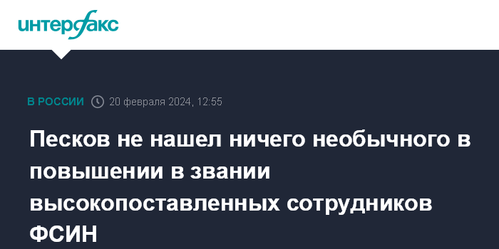 Москва. 20 февраля. INTERFAX.RU - Повышение в звании ряда высокопоставленных сотрудников ФСИН России - часть обычных кадровых процессов, которые идут своим ходом, заявил пресс-секретарь президента РФ Дмитрий Песков.