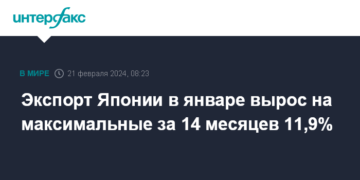 Москва. 21 февраля. INTERFAX.RU - Объем экспорта Японии в январе увеличился на максимальные за 14 месяцев 11,9% относительно того же месяца предыдущего года - до 7,333 трлн иен ($48,88 млрд), говорится в отчете министерства финансов страны.