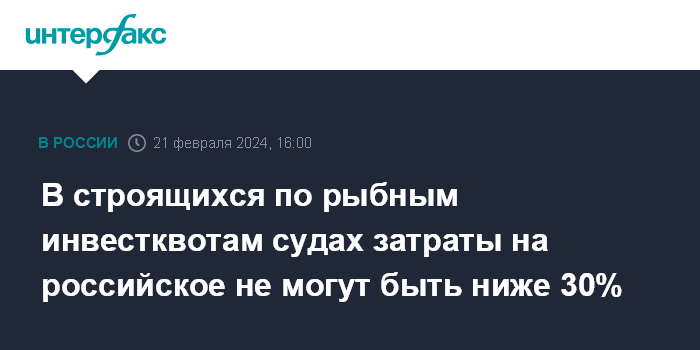 Для рыбопромысловых компаний, занимающихся строительством судов в рамках программы рыбных инвестиционных квот, установлено правило: затраты на товары, работы и услуги, закупаемые в России, должны составлять не менее 30% общей стоимости проекта.