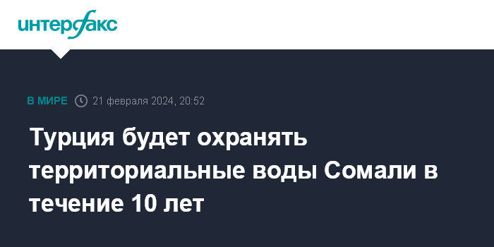 Москва. 21 февраля. INTERFAX.RU - ВМС Турции в рамках подписанного с Сомали соглашения об обороне и экономическом сотрудничестве будет охранять территориальные воды этой страны в течение 10 лет. Об этом сообщает в среду агентство "Анадолу" со ссылкой на заявление президента Сомали Хасана Шейха Махмуда.