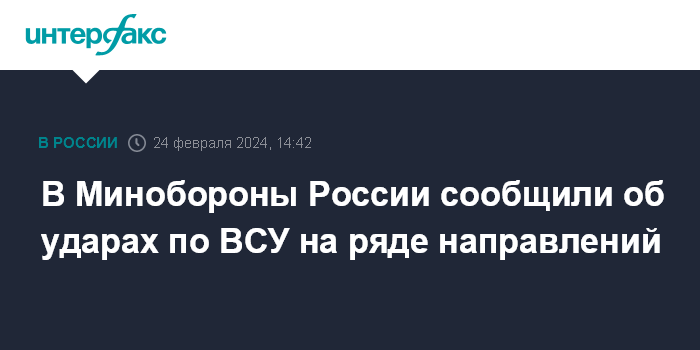 Москва. 24 февраля. INTERFAX.RU - Министерство обороны РФ заявило, что в течение суток российская армия нанесла удары по украинским позициям на купянском, южнодонецком и херсонском направлениях.