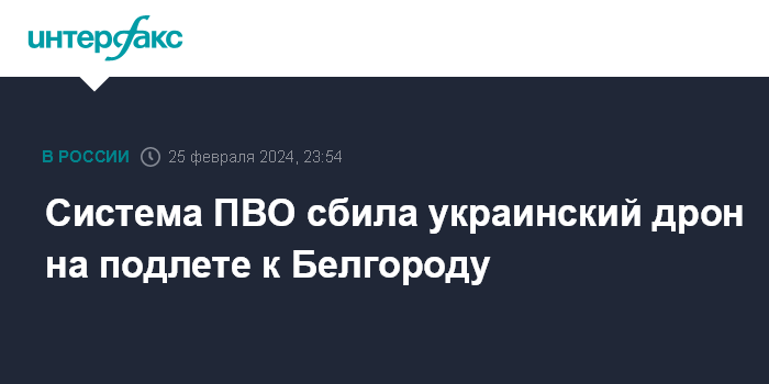 Москва. 25 февраля. INTERFAX.RU - Российские военные сообщили, что система противовоздушной обороны в воскресенье уничтожила украинский беспилотник в Белгородской области.