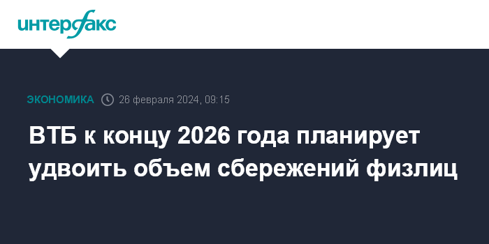 Москва. 26 февраля. INTERFAX.RU - ВТБ к концу 2026 года планирует увеличить объем рублевых сбережений розничных клиентов в два раза - с 6,2 трлн рублей до более чем 11 трлн рублей, сообщил через пресс-службу зампред правления банка Георгий Горшков.