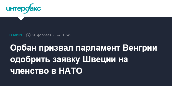 Москва. 26 февраля. INTERFAX.RU - Премьер-министр Венгрии Виктор Орбан в понедельник обратился к парламенту страны с призывом ратифицировать заявку Швеции на вступление в Североатлантический альянс, сообщает агентство EFE.