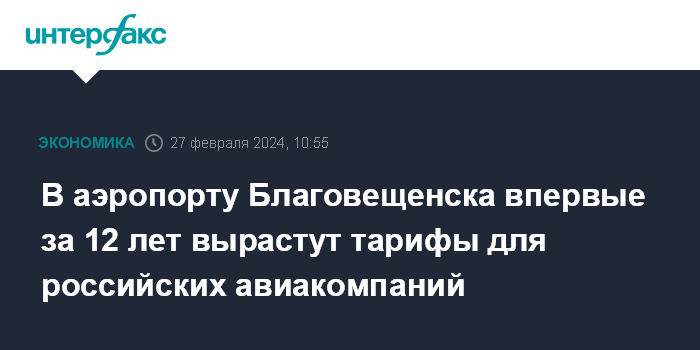 Москва. 27 февраля. INTERFAX.RU - Федеральная антимонопольная служба подписала приказ о повышении тарифов и сборов на обслуживание российских авиакомпаний в аэропорту Благовещенска. Они изменились впервые с 2012 года, рост по разным позициям составит от 9% до почти двух раз.