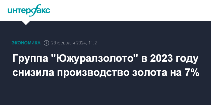Москва. 28 февраля. INTERFAX.RU - Группа "Южуралзолото" (ЮГК) в 2023 году сократила производство на 7% до 412,5 тыс. унций (12,8 тонны) золота, сообщила компания.