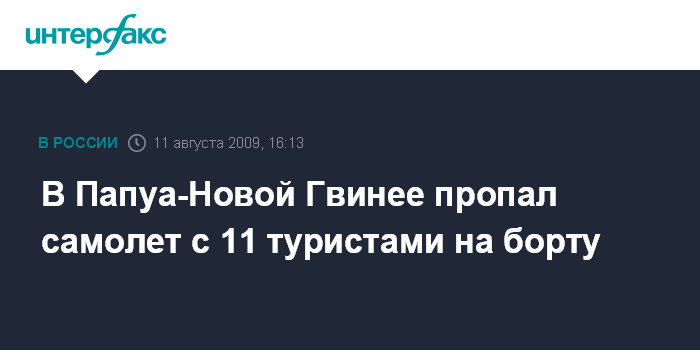 Москва. 11 августа. INTERFAX.RU - Небольшой самолет авиакомпании "Пи-Эн-Джи эрлайнс" с 11 туристами и двумя членами команды на борту пропал во вторник на востоке Папуа-Новой Гвинеи, сообщает агентство ЭФЭ. Самолет вылетел из столицы Порт-Морсби и направлялся в сторону поселения Кокода. Большинство пассажиров - австралийцы. Как заявили представители авиакомпании, самолет пролетел над хребтом Оуэн-Стенли и должен был приземлиться в районе Кокоды, однако, по неизвестным пока причинам, не достиг места назначения. По словам министра иностранных дел Австралии Стивена Смита, плохие погодные условия осложняют поиски самолета.
