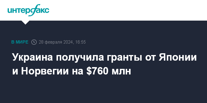 Москва. 28 февраля. INTERFAX.RU - Украина получила $760 млн грантовых средств от Японии и Норвегии, сообщил в соцсетях премьер-министр Украины Денис Шмыгаль.