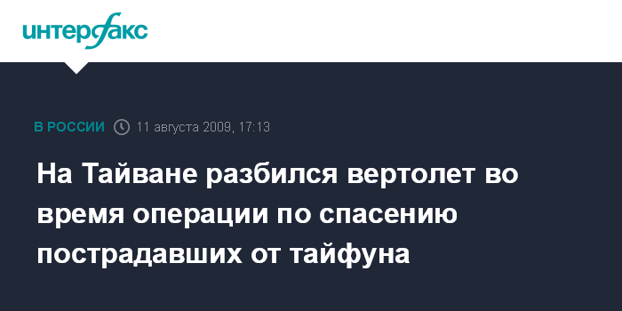 Мадрид. 11 августа. INTERFAX.RU - Вертолет, который должен был спасать пострадавших от тайфуна "Моракот", разбился во вторник на юге Тайваня, сообщает агентство ЭФЭ.