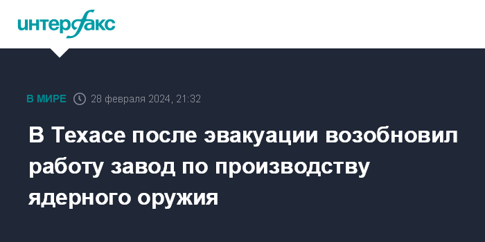 Москва. 28 февраля. INTERFAX.RU - Крупнейший завод США по производству ядерного оружия Pantex, расположенный в штате Техас возобновил работу после перерыва на эвакуацию из-за лесного пожара.