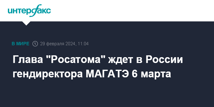 Москва. 29 февраля. INTERFAX.RU - Гендиректор госкорпорации "Росатом" Алексей Лихачев рассчитывает, что глава МАГАТЭ Рафаэль Гросси посетит Россию 6 марта.