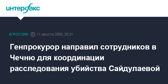 Москва. 11 августа. INTERFAX.RU - Генпрокурор РФ Юрий Чайка направил в Чечню для координации расследования убийства Заремы Сайдулаевой и ее мужа группу работников прокуратуры, сообщила "Интерфаксу" во вторник официальный представитель Генеральной прокуратуры РФ Марина Гриднева.