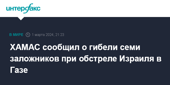 Москва. 1 марта. INTERFAX.RU - До семи заложников, удерживаемых движением ХАМАС в секторе Газа, погибли в результате обстрела израильской стороны, сообщают западные СМИ со ссылкой на представителя военизированного крыла ХАМАС - бригад "Изз ад-Дин аль-Кассам" - Абу Убайду.