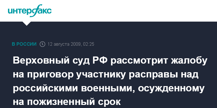 Москва. 12 августа. ИНТЕРФАКС - Верховный суд РФ рассмотрит в среду жалобу на приговор жителю Чечни, осужденному на пожизненное заключение за участие в казни российских военных 5 сентября 1999 года.