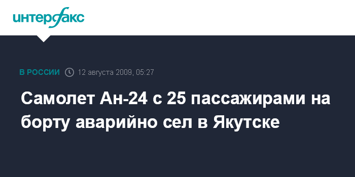 Якутск. 12 августа. ИНТЕРФАКС-ДАЛЬНИЙ ВОСТОК - Пассажирский самолет Ан-24 компании "Якути" совершил аварийную посадку в аэропорту Якутска, сообщил агентству "Интерфакс-Дальний Восток" гендиректор компании Иван Простит.