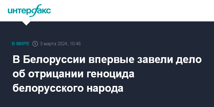 Москва. 3 марта. INTERFAX.RU - В Белоруссии впервые возбуждено уголовное дело по статье об отрицании геноцида белорусского народа, сообщили в МВД республики в воскресенье.