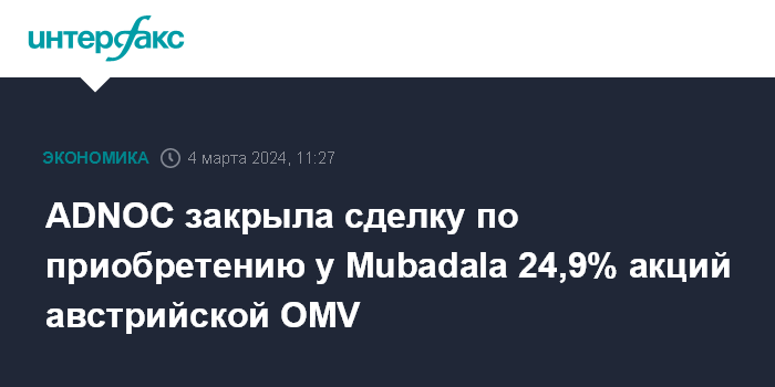 Москва. 4 марта. INTERFAX.RU - Нефтяная госкомпания ОАЭ Abu Dhabi National Oil Co. (ADNOC) успешно закрыла сделку по приобретению 24,9% акций австрийской OMV у Mubadala Investment Company, сообщает ADNOC.