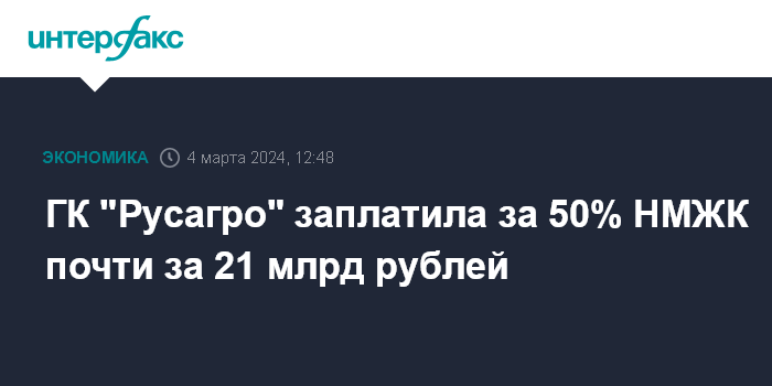 Москва. 4 марта. INTERFAX.RU - Стоимость сделки по покупке группой "Русагро" в 2023 году 50% НМЖК составила 20 млрд 964,5 млн рублей, сообщается в консолидированной отчетности группы. Сделка была закрыта 28 июня 2023 года.