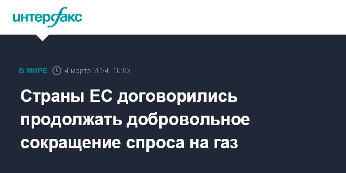 Москва. 4 марта. INTERFAX.RU - Совет ЕС объявил в понедельник, что достиг политического соглашения государств-членов по рекомендации продолжать скоординированное сокращение в Евросоюзе спроса на газ.