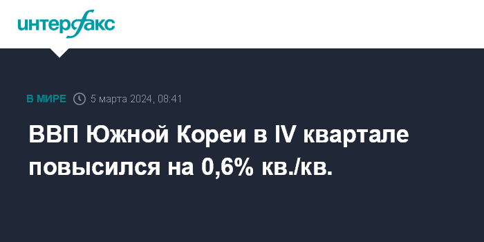 Москва. 5 марта. INTERFAX.RU - Экономика Южной Кореи в четвертом квартале 2023 года выросла на 0,6% относительно предыдущих трех месяцев, говорится в окончательных данных Банка Кореи.