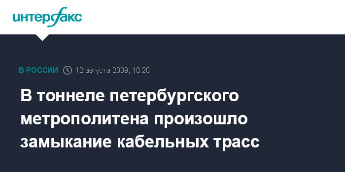Москва. 12 августа. INTERFAX.RU - В тоннеле между двумя станциями петербургского метрополитена в среду утром произошло замыкание кабельных трасс, сообщил "Интерфаксу" источник в ГУ МЧС по Северной столице. "В тоннеле между станциями "Старая деревня" и "Комендантский проспект" произошло перемыкание кабельных жил, серьезных последствий это не вызвало", - сказал собеседник, отметив, что пожарным поступала заявка, бригады выезжали, однако их помощь не потребовалось.