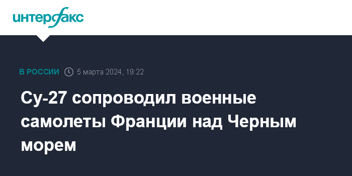 Москва. 5 марта. INTERFAX.RU - Минобороны РФ сообщило о вылете истребителя Су-27 на сопровождение французских военных самолетов в районе Черного моря.