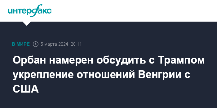 Москва. 5 марта. INTERFAX.RU - Премьер-министр Венгрии Виктор Орбан на встрече с экс-президентом США Дональдом Трампом на этой неделе намерен затронуть темы укрепления связей между двумя странами, а также установления мира в Европе с учетом конфликта на Украине, передает агентство EFE со ссылкой на главу венгерского МИД Петера Сийярто.
