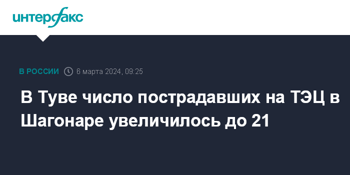 Москва. 6 марта. INTERFAX.RU - В Туве при пожаре на Шагонарской ТЭЦ пострадал 21 человек, сообщили "Интерфаксу" в пресс-службе правительства Тувы.