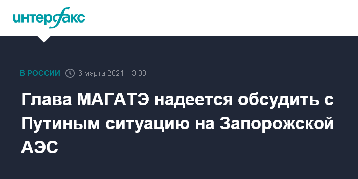 Москва. 6 марта. INTERFAX.RU - Гендиректор МАГАТЭ Рафаэль Гросси намерен обсудить на встрече с президентом Владимиром Путиным в Сочи ситуацию на Запорожской АЭС. Он сказал об этом журналистам после переговоров с главой "Росатом" Алексеем Лихачевым.