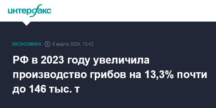 РФ в 2023 году увеличила производство грибов на 13,3% почти до 146 тыс. т