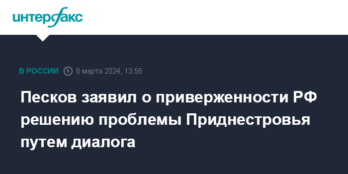 Москва. 6 марта. INTERFAX.RU - Россия до последнего будет выступать за решение проблем Приднестровья путем диалога, заявил пресс-секретарь президента РФ Дмитрий Песков.