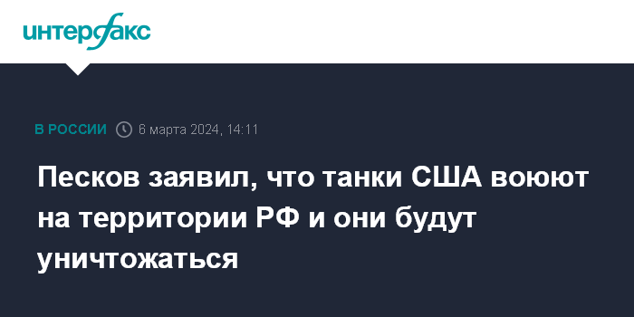 Песков заявил, что танки США воюют на территории РФ и они будут уничтожаться