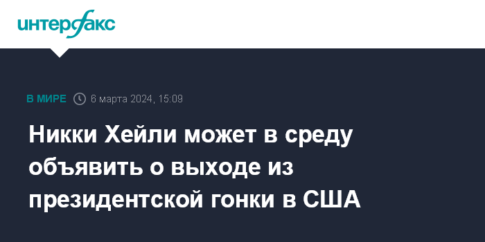 Москва. 6 марта. INTERFAX.RU - Экс-постпред США при ООН Никки Хейли планирует в среду объявить о выходе из гонки за выдвижение кандидатом в президенты страны от Республиканской партии, сообщает The Wall Street Journal (WSJ) со ссылкой на источники.