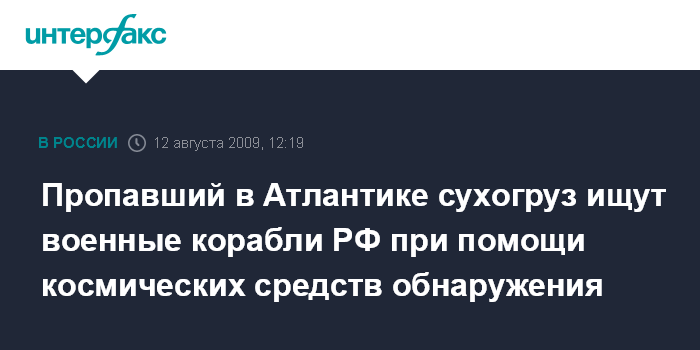 Москва. 12 августа. INTERFAX.RU - Корабли и суда ВМФ России, находящиеся в Атлантике, а также средства обнаружения Минобороны, включая космические, привлечены к поискам пропавшего сухогруза "Arctic Sea" с российским экипажем на борту. Как сообщили "Интерфаксу-АВН" в среду в управлении пресс-службы и информации Минобороны, "основная задача возложена на сторожевой корабль "Ладный" Черноморского флота, который 12 августа прошел пролив Гибралтар и следует установленным курсом".