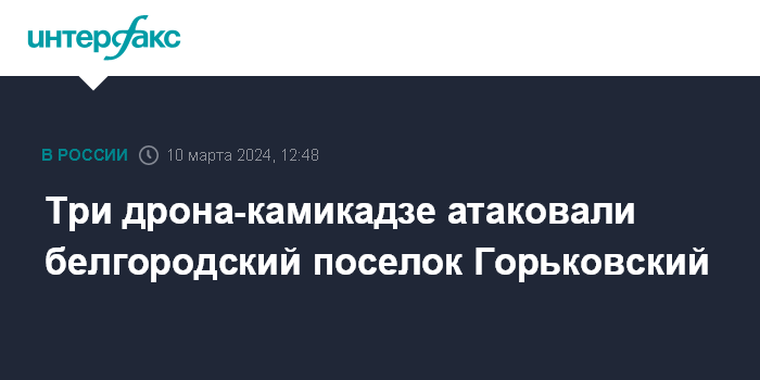 Москва. 10 марта. INTERFAX.RU - Губернатор Белгородской области Вячеслав Гладков сообщил об атаке украинских дронов-камикадзе территории Грайворонского городского округа.