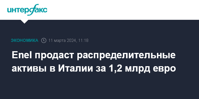 Москва. 11 марта. INTERFAX.RU - Итальянская энергетическая компания Enel SpA договорилась продать ряд энергораспределительных активов местной компании A2A за 1,2 млрд евро.