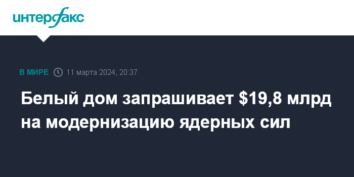 Москва. 11 марта. INTERFAX.RU - Американская администрация предлагает направить $19,8 млрд бюджетных средств на продолжение модернизации ядерных вооружений, говорится в проекте бюджет на 2025 финансовый год.