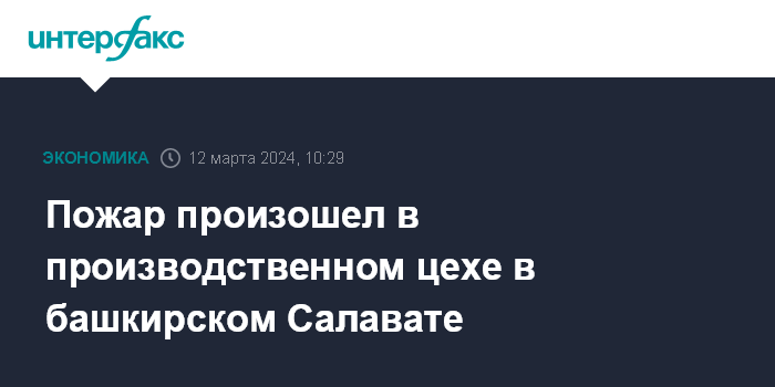 Москва. 12 марта. INTERFAX.RU - Возгорание произошло в производственном цехе по металлообработке в Салавате (Башкирия), сообщила пресс-служба ГУ МЧС по Башкирии.
