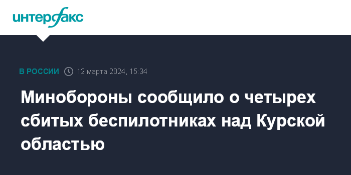 Москва. 12 марта. INTERFAX.RU - Российские военные сбили днем во вторник четыре украинских беспилотника самолетного типа над Курской областью, заявили в Минобороны .