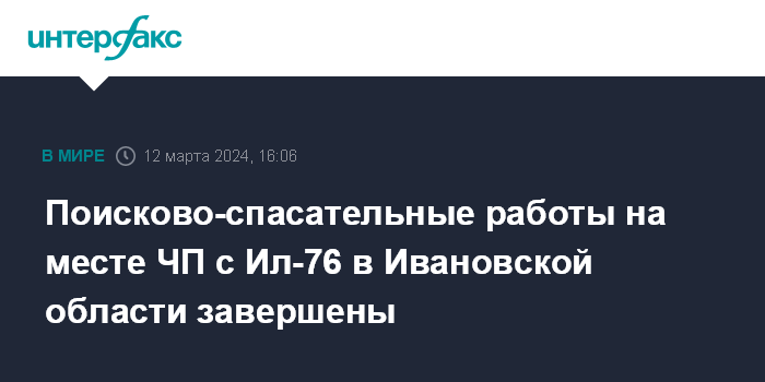 Москва. 12 марта. INTERFAX.RU - Подразделения МЧС России завершили поисково-спасательные работы на месте падения военно-транспортного самолета Ил-76 в Ивановской области, сообщила пресс-служба регионального правительства.