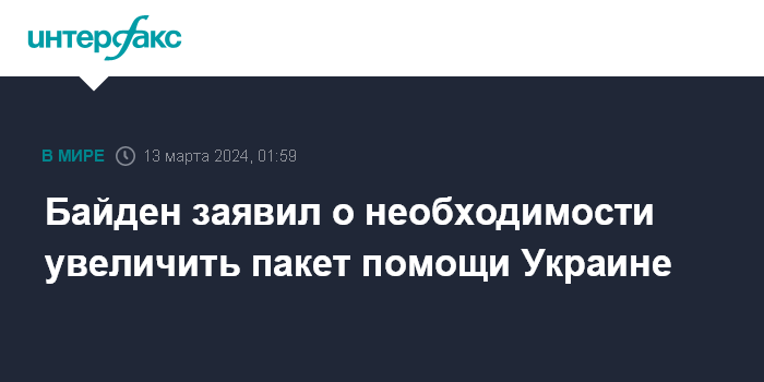 Москва. 13 марта. INTERFAX.RU - Президент США Джо Байден заявил, что нового пакета военной помощи Украине на сумму $300 млн недостаточно для Киева.