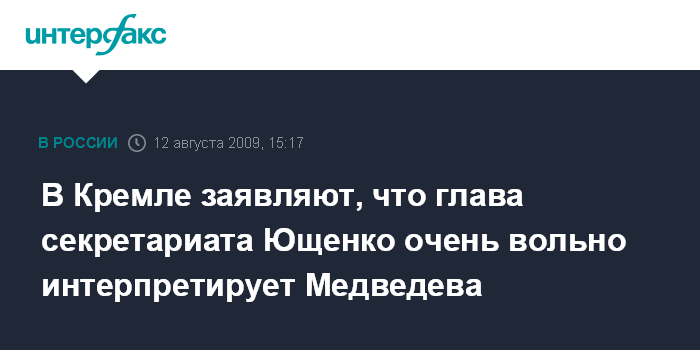 Москва. 12 августа. INTERFAX.RU - В Кремле обратили внимание на чрезвычайно вольную интерпретацию послания президента РФ Дмитрия Медведева президенту Украины Виктору Ющенко, прозвучавшую в письме за подписью главы секретариата Ющенко Веры Ульянченко.