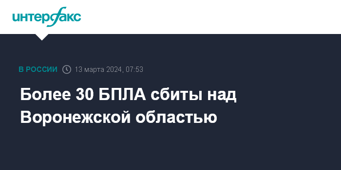 Москва. 13 марта. INTERFAX.RU - Губернатор Воронежской области Александр Гусев сообщил об уничтожении свыше 30 беспилотников над регионом в ночь на среду.