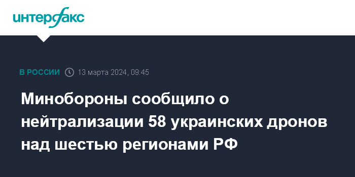 Москва. 13 марта. INTERFAX.RU - Министерство обороны России заявило, что за ночь и утро 13 марта нейтрализовано 58 украинских беспилотных летательных аппаратов (БПЛА), их них два - над Ленинградской и Рязанской областями.