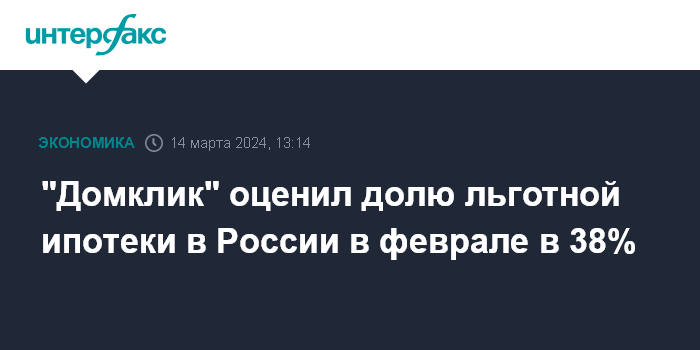 Москва. 14 марта. INTERFAX.RU - В России в феврале доля льготной ипотеки в общем объеме сделок составила 38%, подсчитали эксперты "Домклик" Сбербанка.
