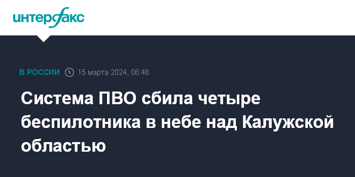 Москва. 15 марта. INTERFAX.RU - Система противовоздушной обороны уничтожила четыре беспилотника в Дзержинском районе Калужской области, сообщил в пятницу глава региона Владислав Шапша.